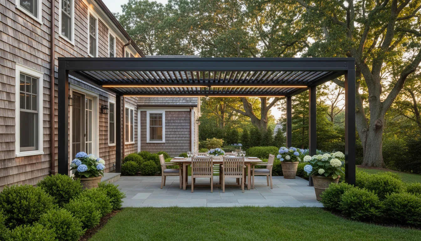 Motorized louvered aluminum pergolas provide the best year-round performance — adjustable shade, rain protection, and snow-load ratings that traditional wood lattice pergolas can't match.