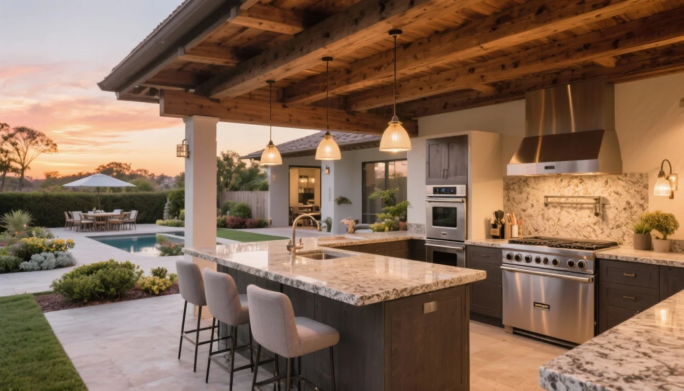 Seamless integration with outdoor kitchen design, including prep areas, storage, and dining space.